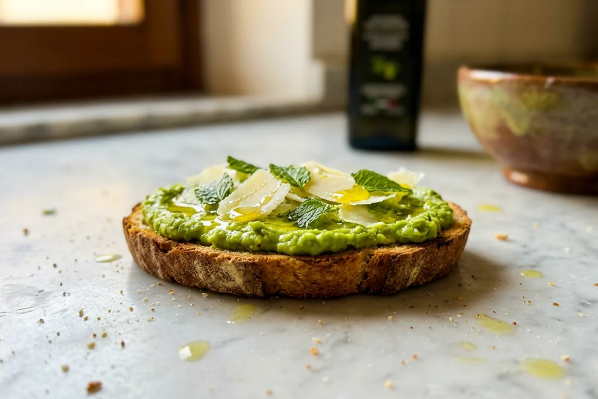 Puoi preparare in anticipo la crema di fave e affettare il pane, ma è meglio tostare e assemblare all’ultimo. Se devi organizzarti, tosta il pane fino a metà cottura, lascialo raffreddare su una griglia (non impilato) e finisci la tostatura pochi minuti prima di servire; poi spalma la crema appena prima di portare in tavola, così restano croccanti e fresche.