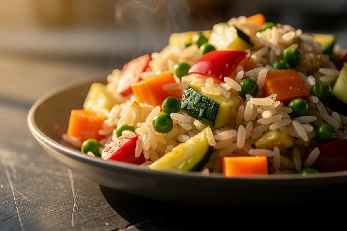 Perché proprio queste verdure? Zucchina, carota, peperone e piselli hanno tempi di cottura simili: si ammorbidiscono con il vapore del riso senza diventare poltiglia. Tagliale tutte a cubetti piccoli e regolari: è il dettaglio che fa la differenza nella cottura uniforme.