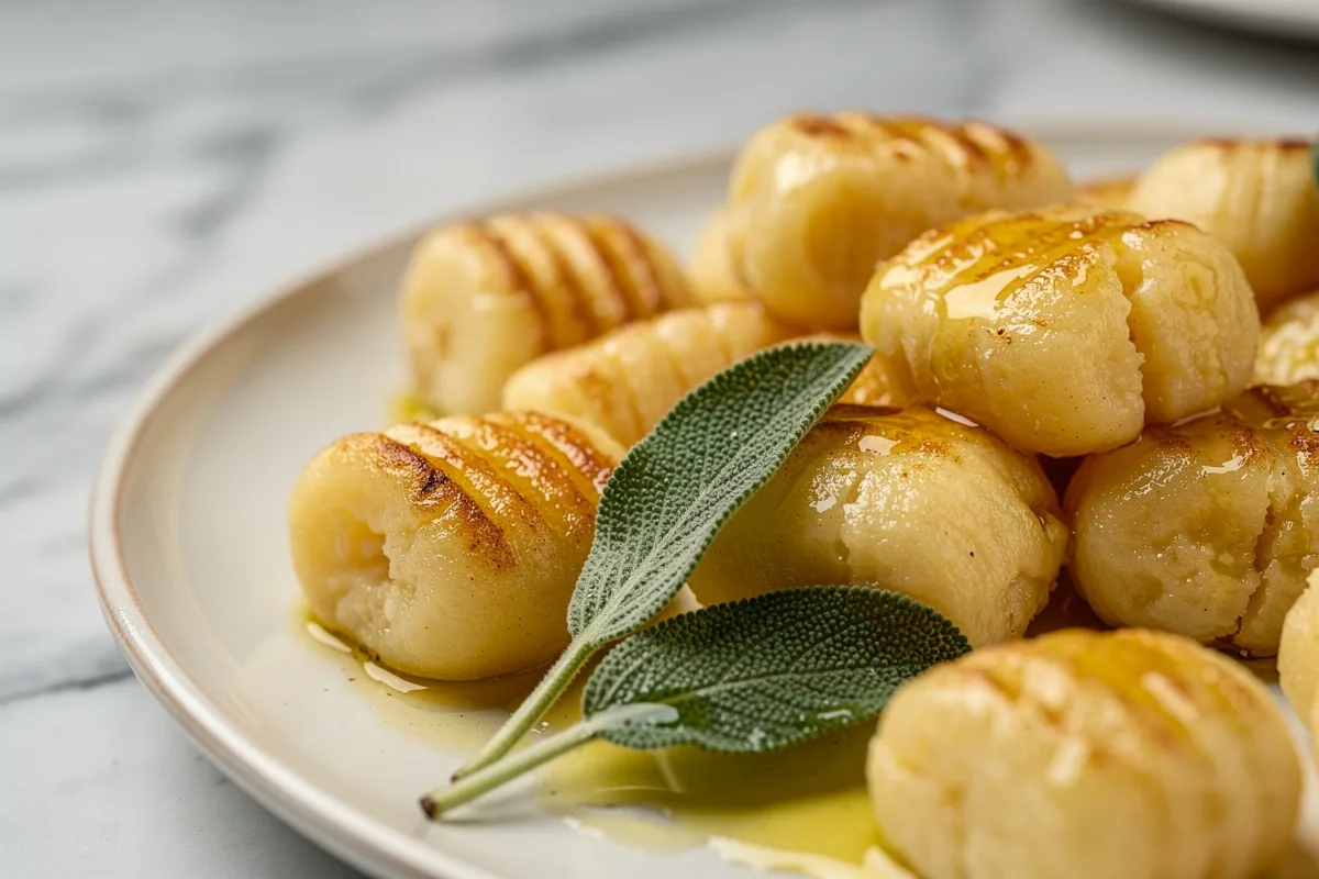 Nel frattempo sciogli il burro con la salvia in una padella ampia, a fiamma dolce, finché le foglie diventano lucide e appena croccanti sui bordi. Salta gli gnocchi nel condimento per pochi istanti, aggiungendo, se serve, un cucchiaio di acqua di cottura per legare.