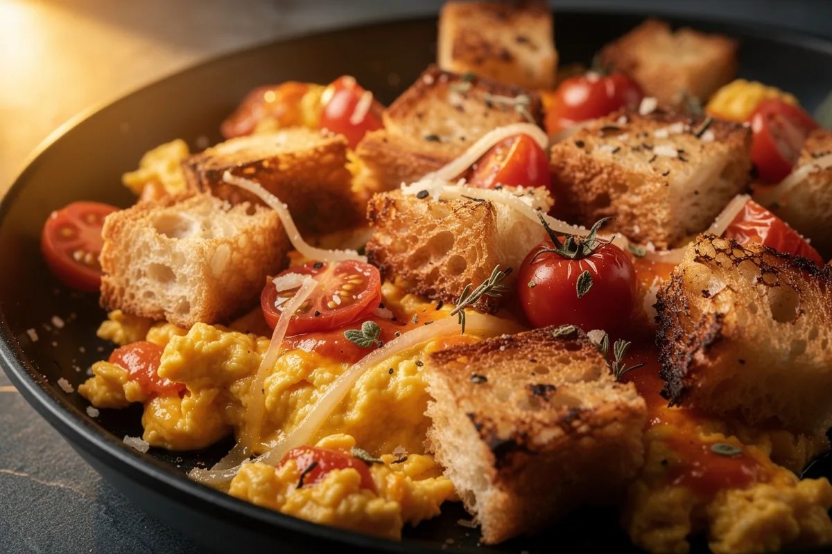 Il pane andrebbe tagliato a cubi di 1,5–2 cm: troppo piccoli si sfaldano, troppo grandi restano asciutti al centro. Le uova, arricchite da un goccio di latte, creano una sorta di crema che lega il tutto, mentre i pomodorini aggiungono umidità e freschezza.