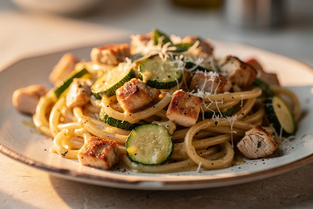 Il formato ideale è una pasta corta che tenga bene la cottura: mezze maniche, fusilli, sedanini rigati. Il petto di pollo va tagliato a dadini piccoli e regolari, così cuoce in fretta senza seccarsi. Le zucchine aggiungono freschezza e acqua vegetale, utilissima per la cremosità finale.