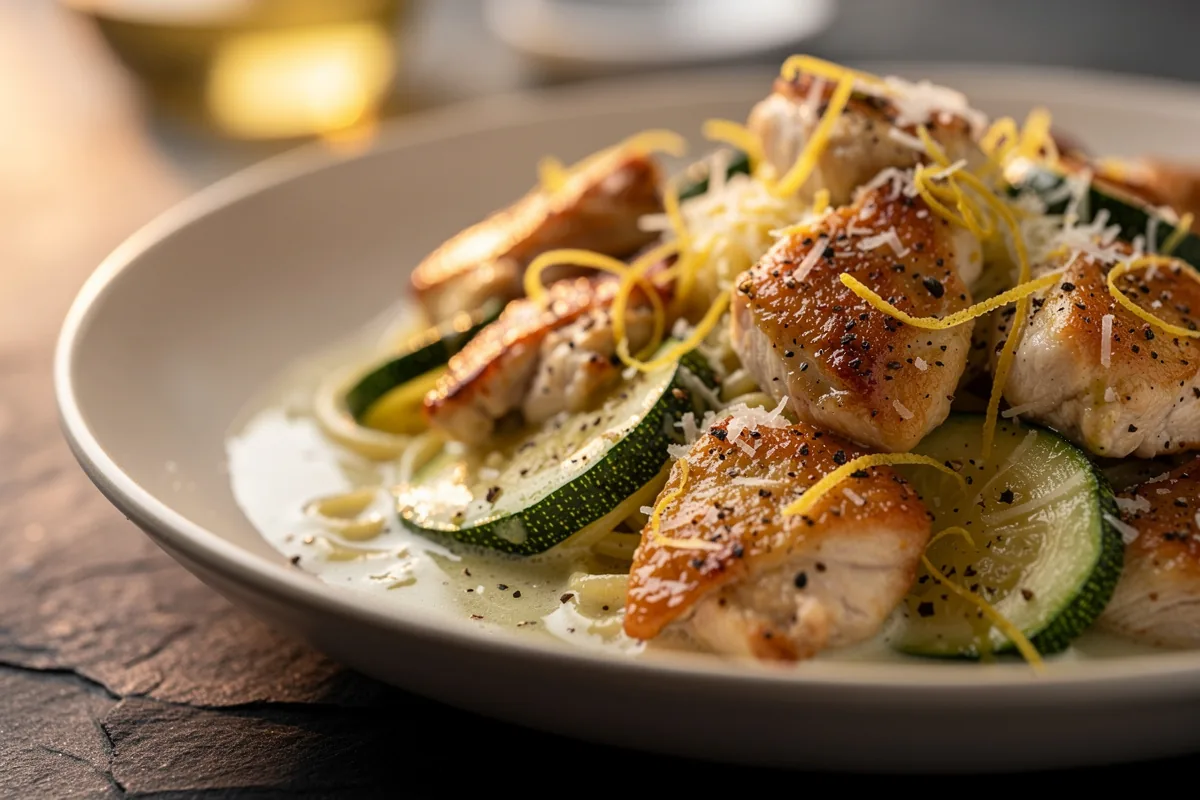 Per dare un aspetto curato, non buttare tutto nel piatto alla rinfusa. Crea prima una base di zucchine, poi adagia sopra le striscioline di pollo ben visibili. Completa con una grattata finale di Parmigiano Reggiano, pepe nero macinato al momento e, se lo hai, qualche fogliolina di timo fresco o una zesta sottile di limone.