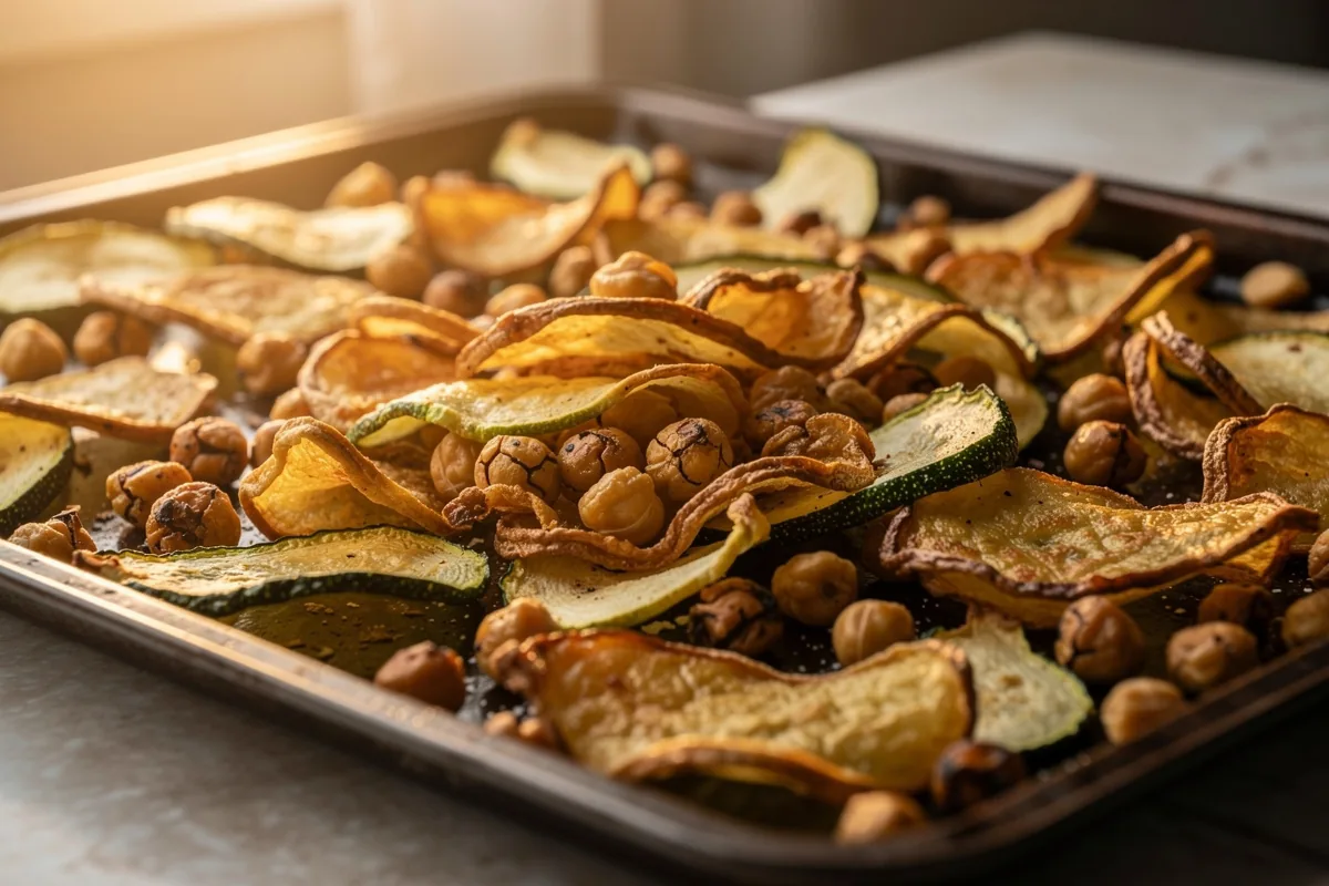 Inforna e cuoci finché tutto è dorato: i ceci impiegano circa 25–30 minuti, le patate 20–25, le zucchine 15–18. Un trucco da professionista: dopo i primi 10 minuti, apri il forno per pochi secondi e scuoti leggermente la teglia, oppure gira con una spatola sottile. Questo fa evaporare il vapore in eccesso e favorisce la croccantezza. Gli ultimi 3–4 minuti puoi alzare a 205 °C se desideri una doratura più intensa.