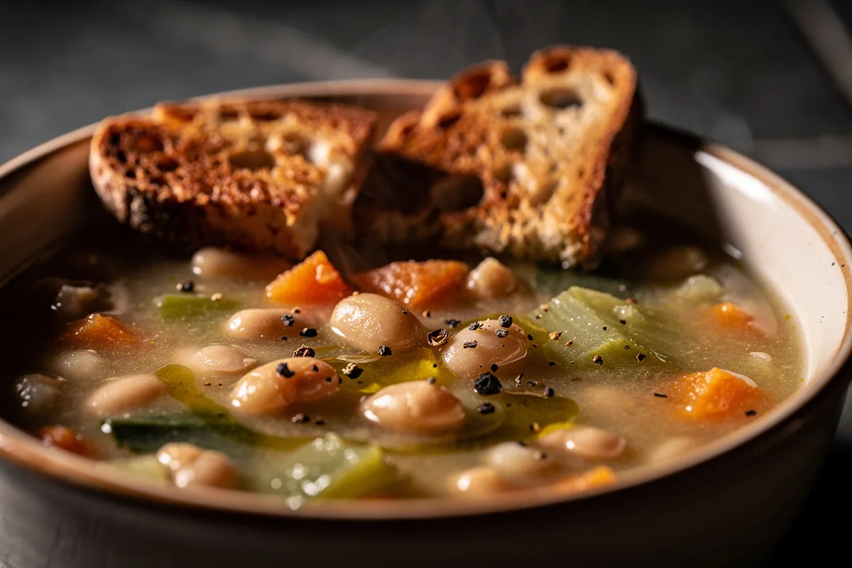 Al momento di servire, versa la zuppa nelle ciotole calde (anche solo sciacquate con acqua bollente per non farla raffreddare subito) e completa con crostini, un filo d’olio crudo e, se non hai usato la crosta in cottura, una grattata di Parmigiano o pecorino. Una manciata di prezzemolo tritato o di erba cipollina fresca dà un colpo di colore e freschezza.